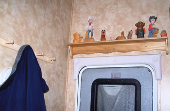 The shelf over the door was an add-on too. I had always wanted a place to display a few of my wood carvings and the space over the door in our new fifth wheel seemed to be the spot for a display shelf. It took a while but I finally found the shelf at Michaels… a craft store. It was unfinished and was actually too big when I bought it. After, cutting it to fit and spraying it with semi-gloss Deft lacquer it comes acceptably close to matching the cabinetry.